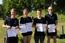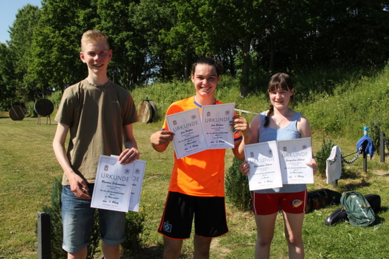 In der Jugendklasse siegte Francesca Gierke (Dänischenhagen) sowohl im Sprint (19:05, 2 Fehler) wie auch den Massenstart (27 min., 3 Fehler). Bei der männlichen Jugend setzte sich im Sprint Benedikt Becker (Dänischenhagen) im Sprint (14:25, 3 Fehler) vor dem Möllner Tim Dinter (15:50, 6 Fehler) durch. Im Massenstart (25:00, 9 Fehler) gewann Tim Dinter den Landestitel. Bei den Junioren weiblich kämpfte Jonna Ostermann (Klein Wesenberg) gegen sich selbst, denn sie hatte keine Kontrahentin. Den Sprint beendete sie mit drei Fehlern und einer Laufzeit von 20:44 Minuten. Im Massenstart hatte sie leider ein paar Probleme mit der Kartusche, die entleerte sich anscheinend wegen der Hitze selbst, so dass die Schüsse alle tief lagen und sie die Klappscheiben nicht traf. Dadurch hatte sie 13 Fehlschüsse, aber sie kämpfte trotzdem tapfer weiter, obwohl es hieß zusätzlich noch mal 13 Strafrunden a` 70 m zu laufen. Nach genau 42 Minuten kam sie glücklich aber total ausgepowert ins Ziel.