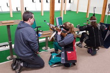 Danach ging es auf den Schießstand, und die Jugendlichen mussten zuerst ohne Handschuh, Schießjacke, Schießhose und Schießschuhe schießen. Erstens können die Trainer dann besser sehen, ob sich die Schützen verdrehen, und die Jugendlichen merken wie die Muskeln und Sehnen in Bewegung sind, wenn man ohne Ausrüstung schießt.
