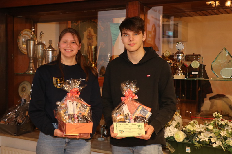 Für ihre deutschen Meisterschaftstitel bekamen Emilia Callsen (SchV Tarp/KK-Liegendkampf) und Knut Jacubczik (VfL Tremsbüttel/Recurve Bogen) einen Präsentkorb von der Landesjugendleitung überreicht.